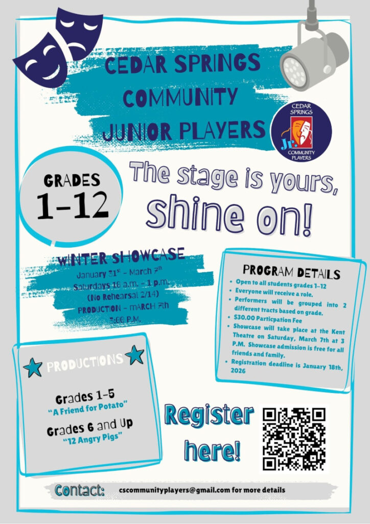We’re excited to announce that the Cedar Springs Community Junior Players Winter Showcase is back! All children in 1st–12th grade are invited to join us. Everyone who registers will receive a role!